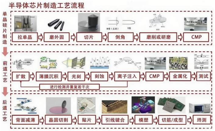·前道制造工艺:经过薄膜沉积,光刻,刻蚀,离子注入,研磨,金属化等工艺形成一个个晶体管。